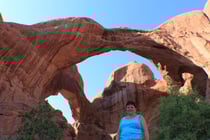 Jetzt gehts los zuerst schön sanft gehts zur langgezogenen, schönen Landscape Arch. Danach ist klettern angesagt, ab hier kommen schon nicht mehr alle Touristen mit. Wir sind dabei und gehen die Partition Arch und Navajo Arch besuchen. Es geht weiter die Berge hoch bis zur Double O Arch und zuletzt wollen wir es jetzt wissen und gehen zum Dark Angel. Dieser ist zwar Dark aber wie ein Engel sieht er nur mit viel Fantasie aus. Es ist heiss, wir haben genügend Wasser und gesundes Obst bei uns. Jetzt im Uebermut nehmen wir den Rückweg via Primitive Trail. Der Name sagt es der Weg ist nicht nur primitiv sondern mit Adventure Einlagen gespickt. So klettern wir an fast überhängenden Felspartien entlang und überqueren einen kleinen Teich über die Felsen, wo ich sogar das Fotografieren vergessen habe. Durch eine lange dürre Sanddürre gehts zurück zum Main Trail. Auf dem Rückweg nehmen wir noch den Pine Tree Arch und den Tunnel Arch. Jetzt erschöpft bei Auto angelangt machen wir noch einen Ausflug zu den Delicate Arch, das ist der freistehende schöne Felsbogen, der auf vielen Postkarten zu sehen ist. Es ist ein Prachtsstück und wir sind glücklich mit dem Auto ins Hotel zu fahren. Beim feinen Nachtessen in Moab beschliessen wir den Tag und sehen noch paar Landsleute am Nebentisch.